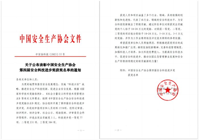 “中國(guó)安全生產(chǎn)協(xié)會(huì)第四屆安全科技進(jìn)步獎(jiǎng)”!